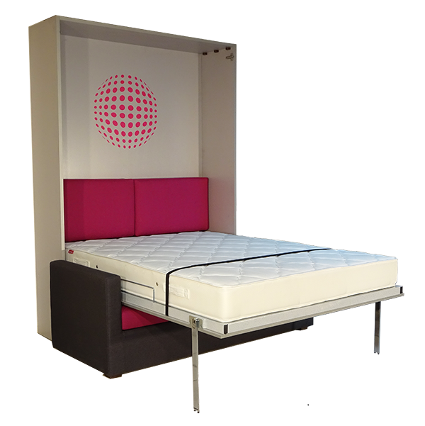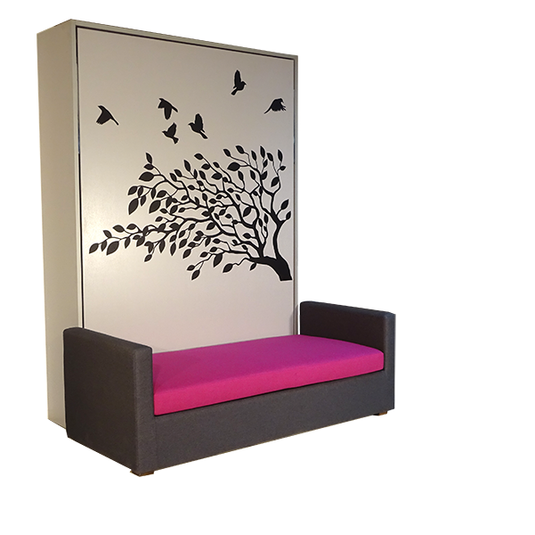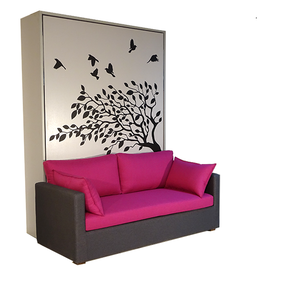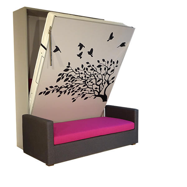 Εντοιχιζόμενο κρεβάτι με μηχανισμό ελατηρίων και φρένο πίσω από καναπέ, που ανοιγοκλείνει με μία απλή κίνηση πάνω του. (max 44 εκ.ύψος καναπέ) Ενδεικτική τιμή για διάσταση 150×200. (Περιέχει ορθοπεδικό τελάρο και στρώμα ) Παράγεται σε οποιαδήποτε διάσταση στρώματος έως 160cm Χ 200cm σε όρθια ή πλάγια θέση.